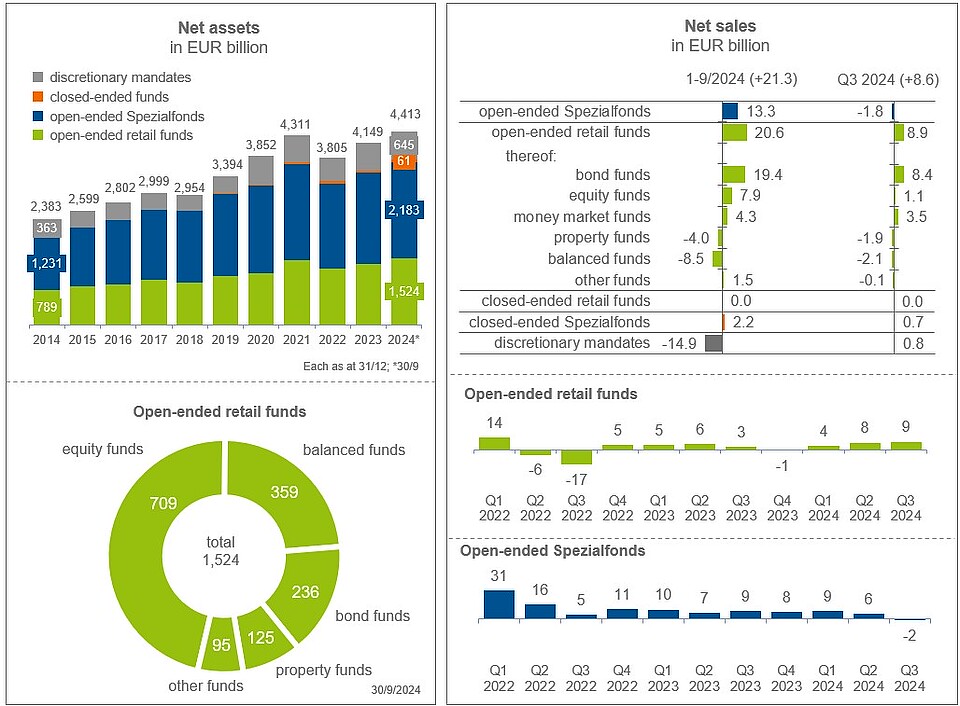 The fund industry manages a record EUR 4,413 billion in assets for investors in Germany as at the end of September. This is an increase of over 6 per cent since the beginning of the year (EUR 4,149 billion). At EUR 2,183 billion, the majority is accounted for by open-ended Spezialfonds for institutional investors. These are primarily retirement pension schemes (EUR 768 billion) and insurers (EUR 536 billion). The fund companies manage EUR 1,524 billion in open-ended retail funds, EUR 645 billion in mandates and EUR 61 billion in closed-ended funds.