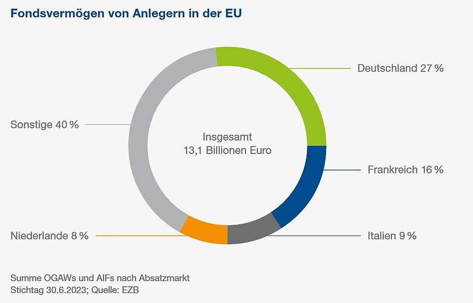 Private und institutionelle Anleger in der EU haben insgesamt 13.100 Milliarden Euro in Investmentfonds angelegt. Deutschland ist dabei mit einem Vermögen von 3.600 Milliarden Euro der größte Markt.