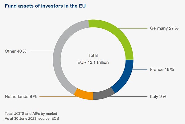Retail and institutional investors in the European Union have a total of EUR 13,100 billion invested in funds. Germany is the largest market, with assets of EUR 3,600 billion.
