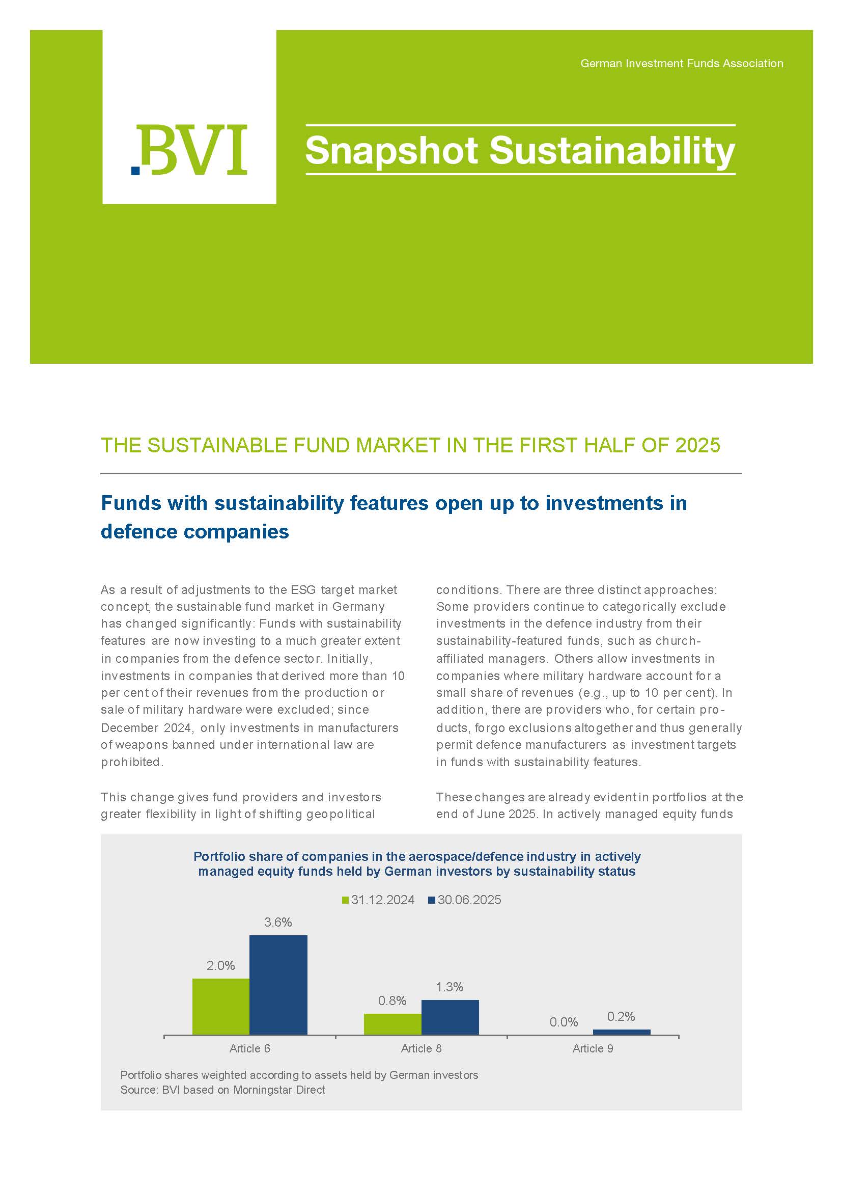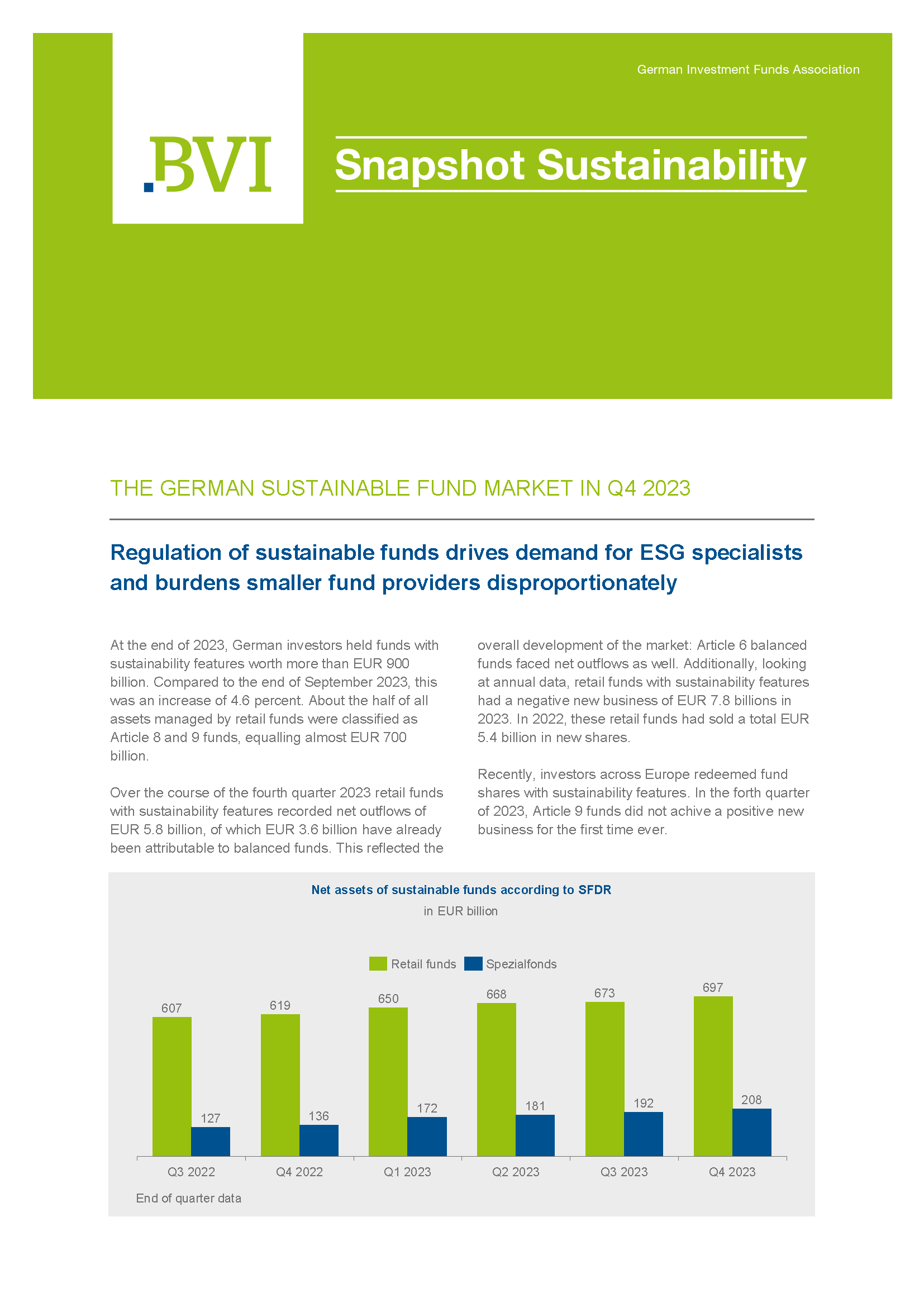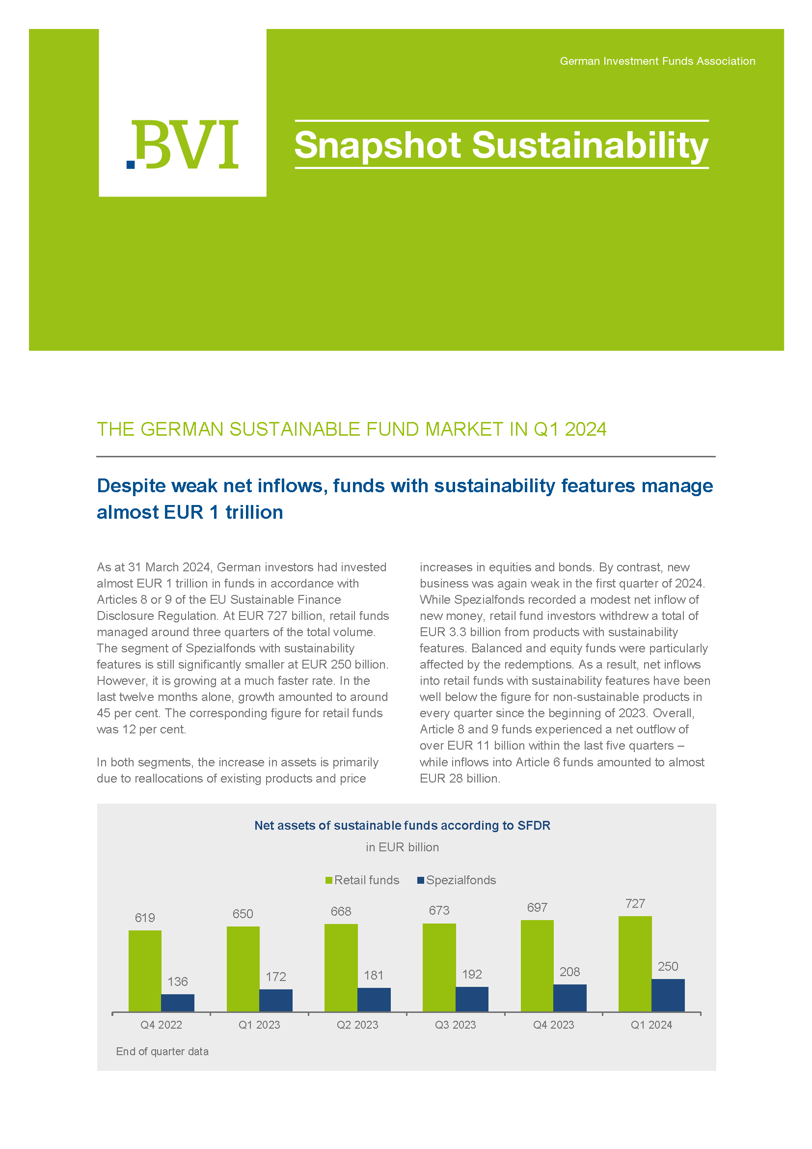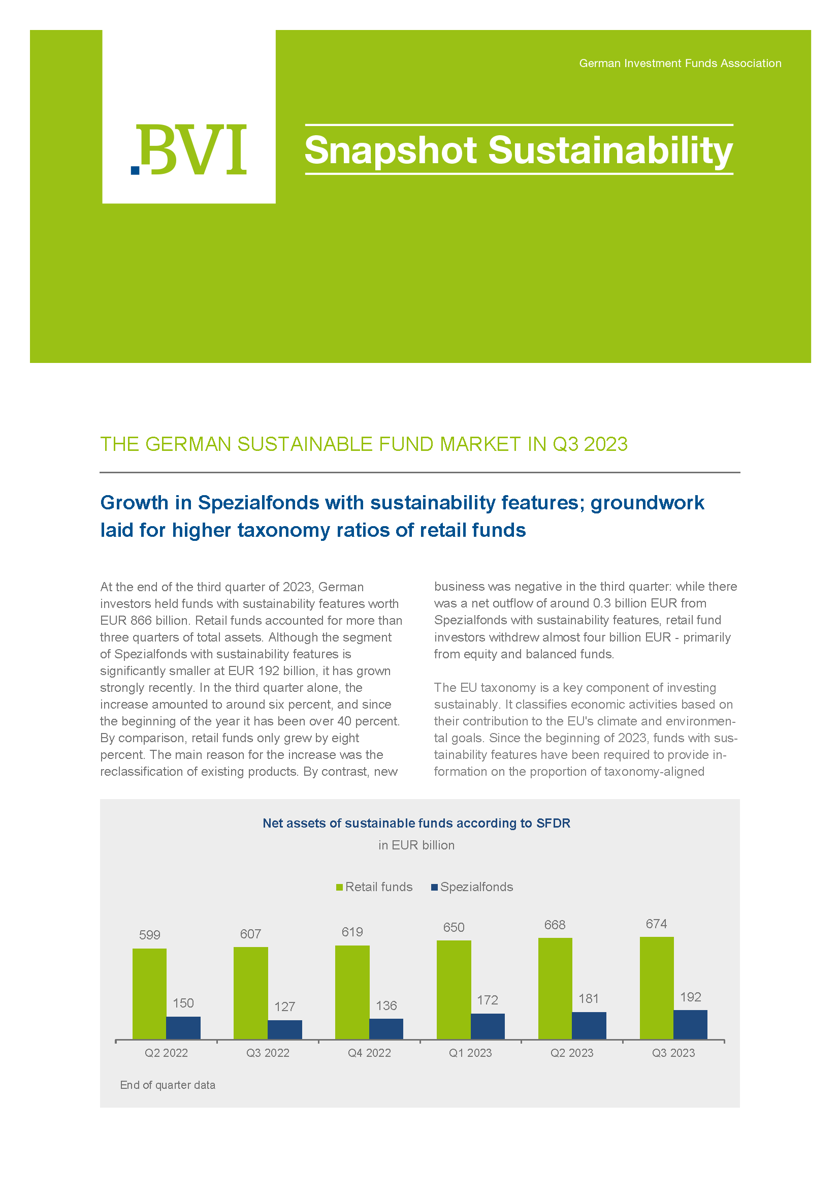 Growth in Spezialfonds with sustainability features; groundwork laid for higher taxonomy ratios of retail funds.