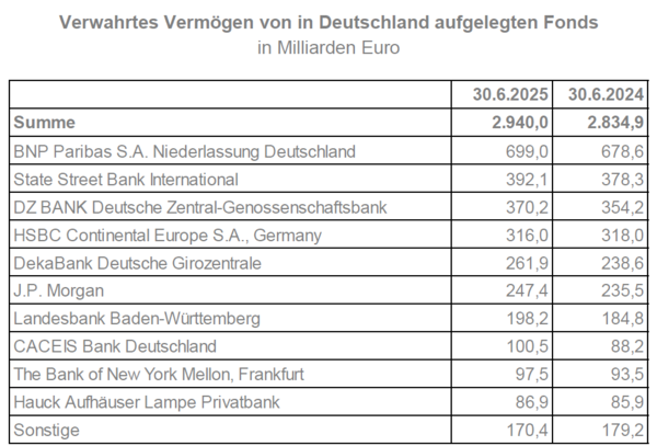 Die Depotbanken verwahrten zum 30. Juni 2025 insgesamt 2.940 Milliarden Euro für in Deutschland aufgelegte Fonds. Das sind 105 Milliarden Euro mehr als zur Jahresmitte 2024 (2.835 Milliarden Euro). Auf die fünf größten Anbieter entfallen 69 Prozent (2.039 Milliarden Euro) des Marktes. BNP Paribas führt die Liste mit 699 Milliarden Euro an. Es folgen die State Street Bank mit 392 Milliarden Euro und die DZ Bank mit 370 Milliarden Euro.
