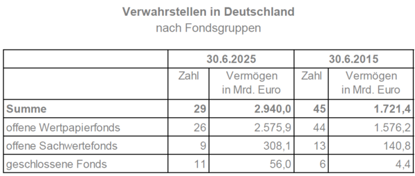 26 Verwahrstellen sind im Geschäft mit offenen Wertpapierfonds mit einem Vermögen von 2.576 Milliarden Euro tätig. 9 Depotbanken verwahrten ein Netto-Vermögen von 308 Milliarden Euro für offene Sachwertefonds. Im Segment der geschlossenen Investmentfonds, die nach den Vorschriften des Kapitalanlagegesetzbuchs aufgelegt sind, betreuen 11 Verwahrstellen ein Netto-Vermögen von 56 Milliarden Euro.