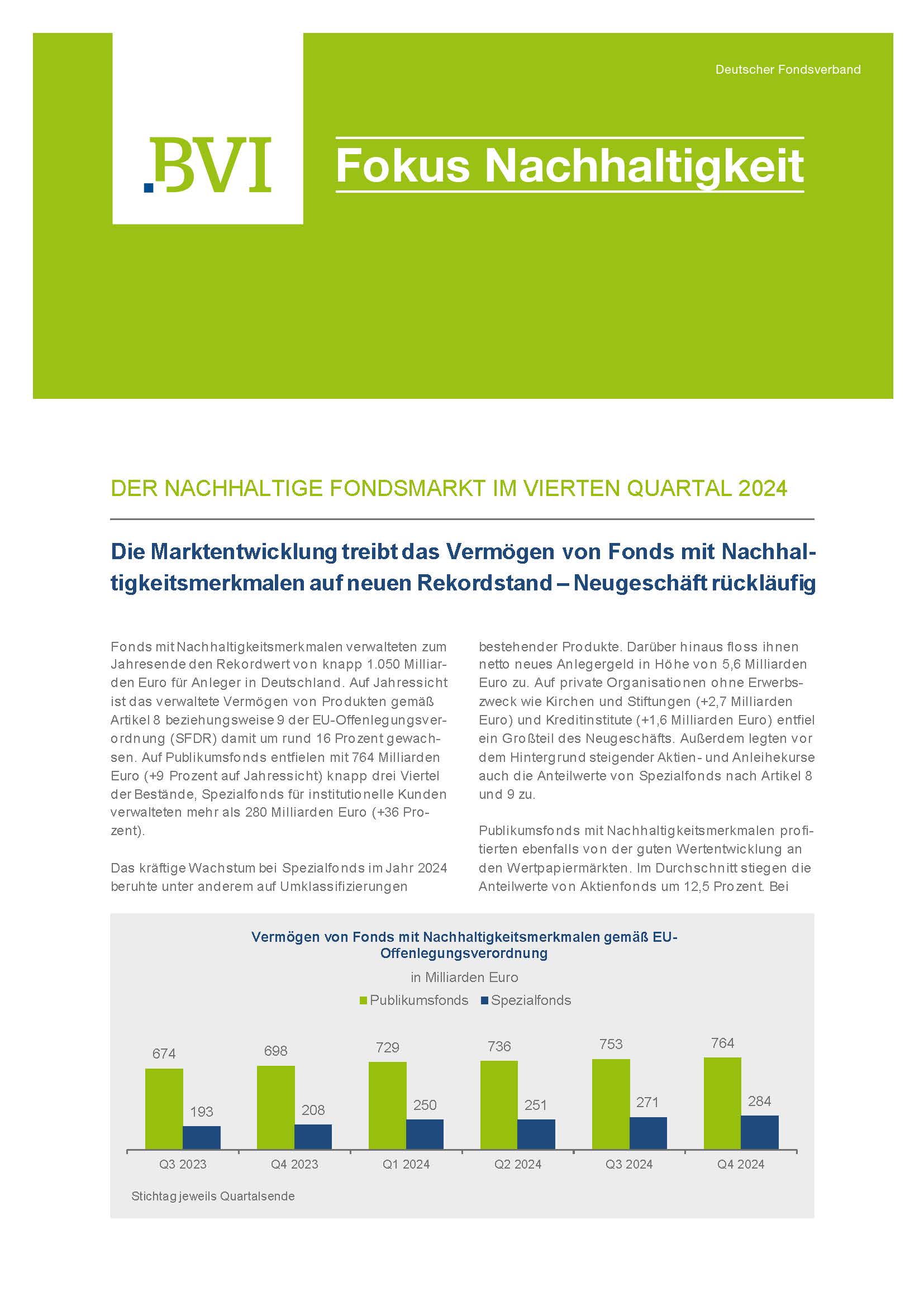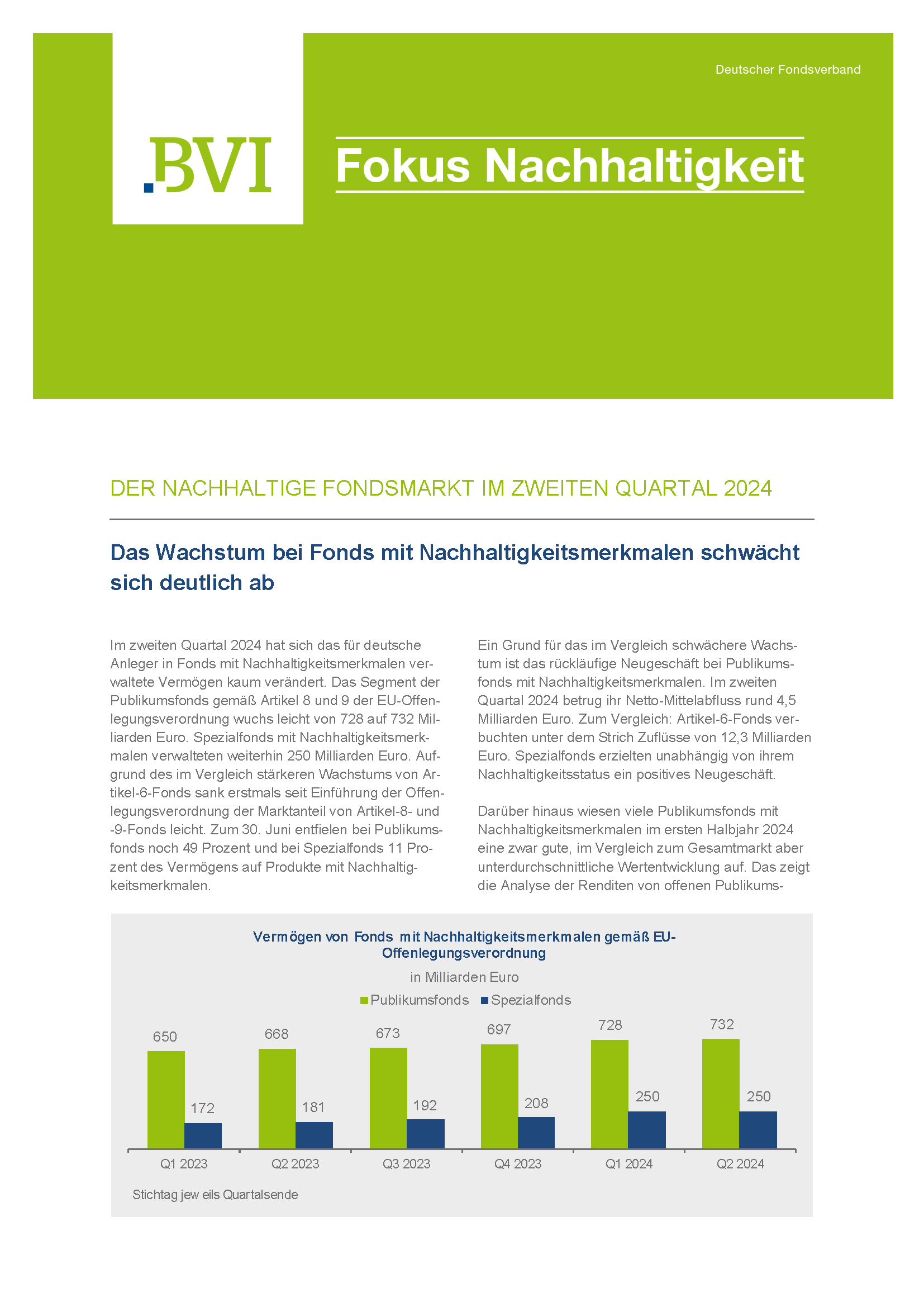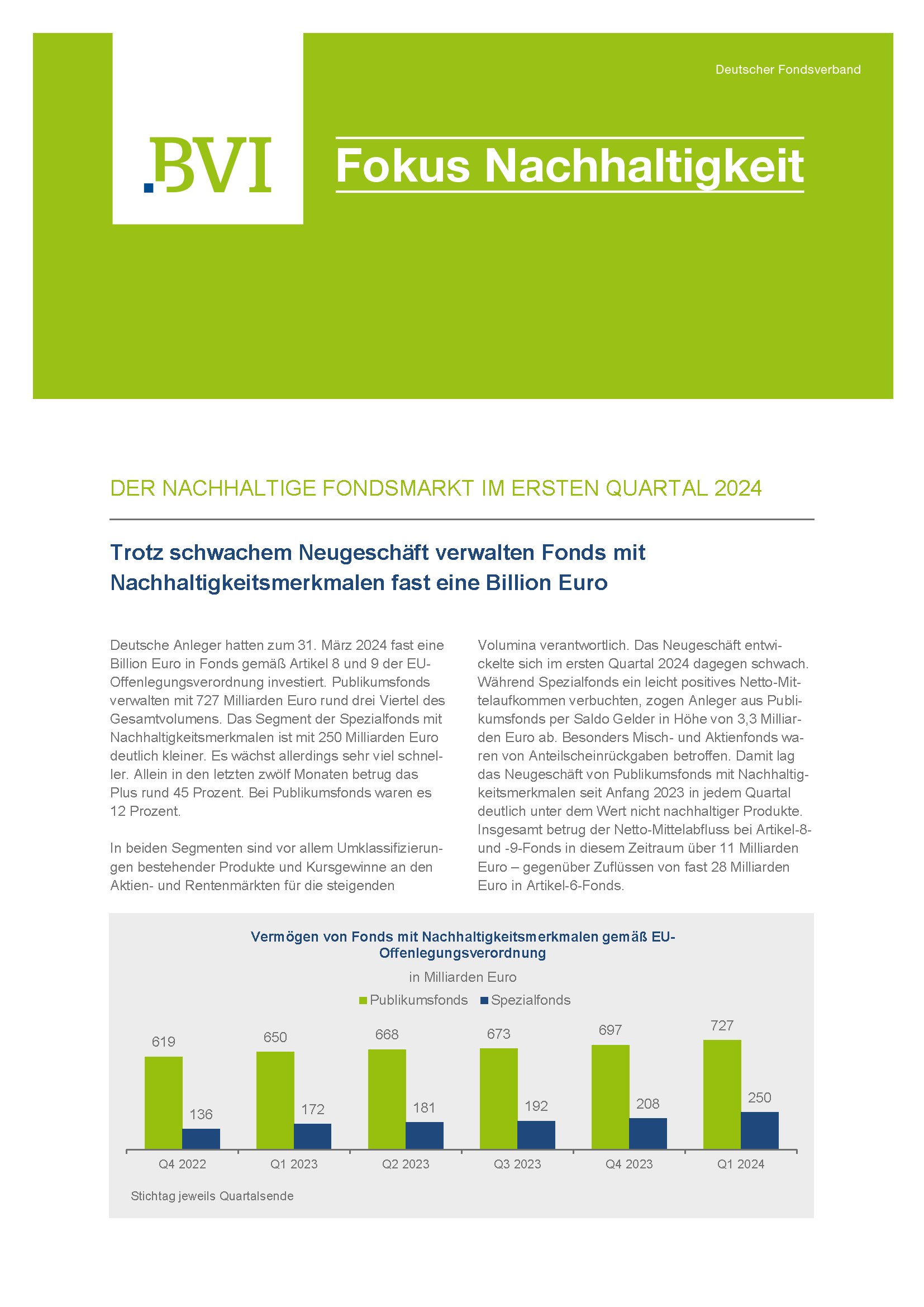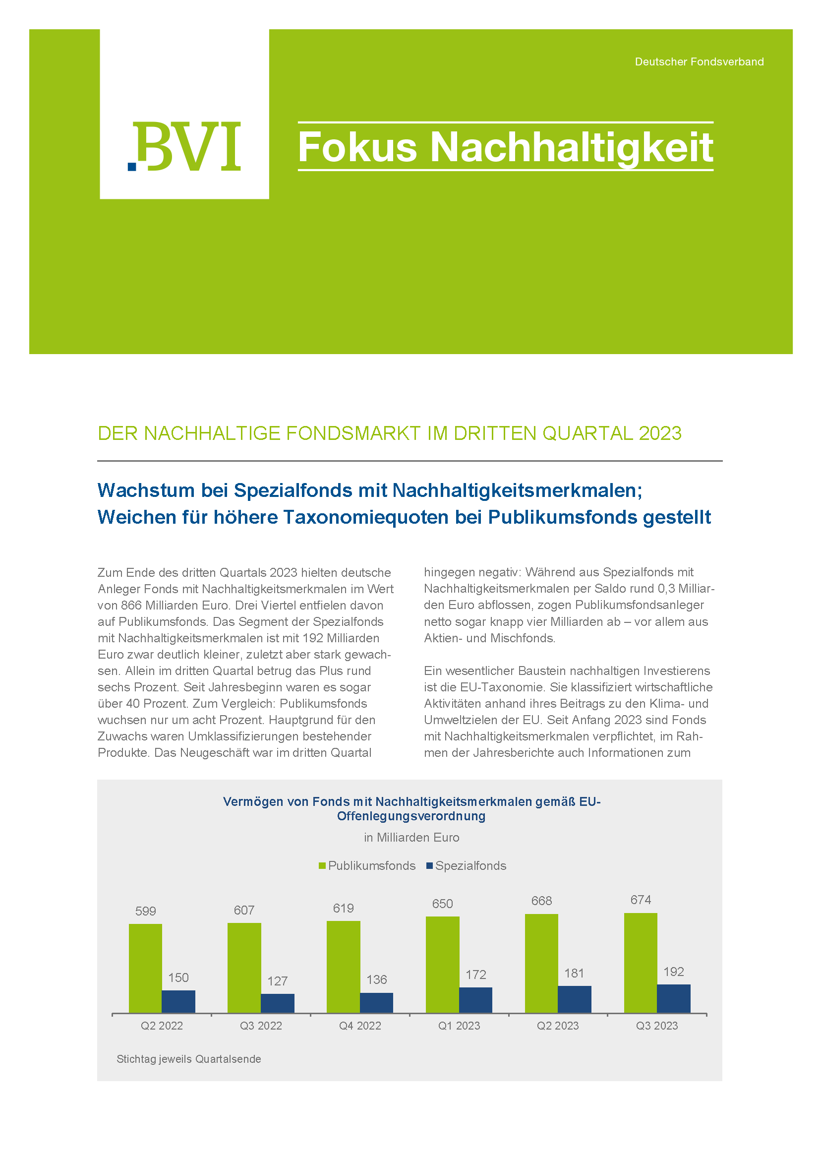 Wachstum bei Spezialfonds mit Nachhaltigkeitsmerkmalen; Weichen für höhere Taxonomiequoten bei Publikumsfonds gestellt.