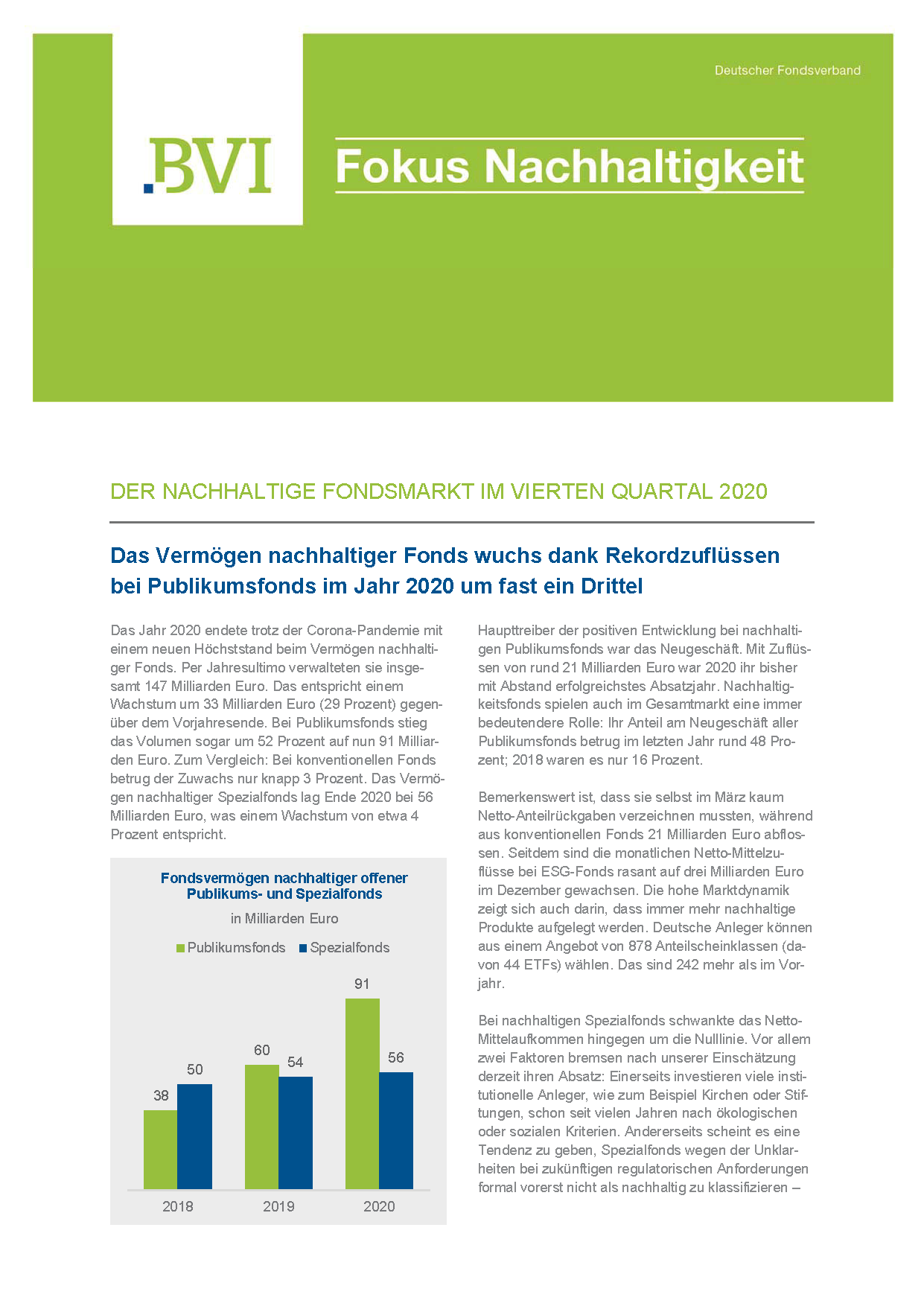 Das Vermögen nachhaltiger Fonds wuchs dank Rekordzuflüssen bei Publikumsfonds im Jahr 2020 um fast ein Drittel.