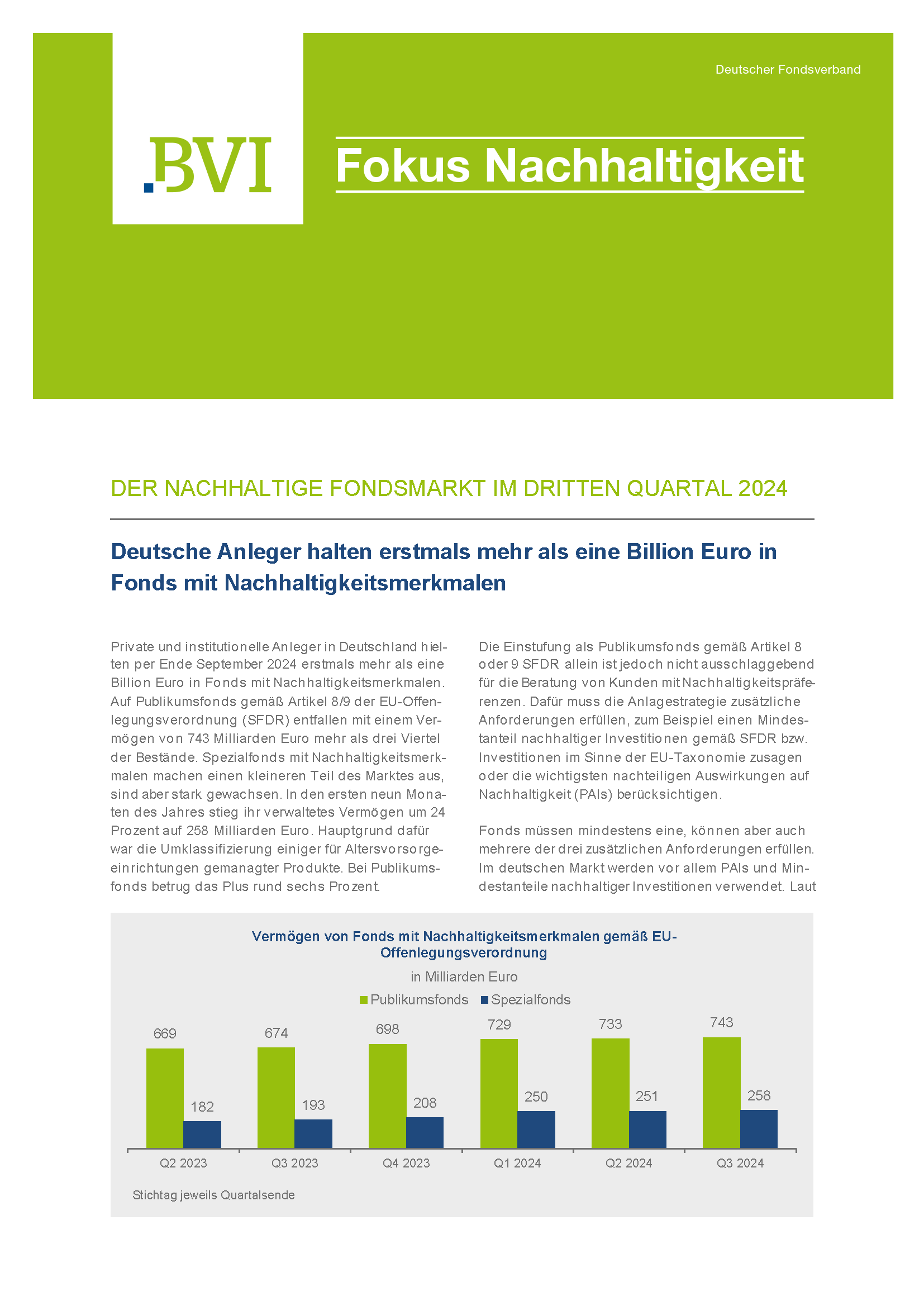 Deutsche Anleger halten erstmals mehr als eine Billion Euro in Fonds mit Nachhaltigkeitsmerkmalen.